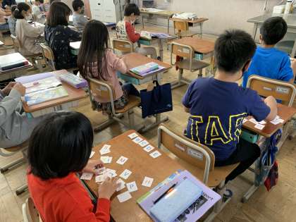 アルファベットをおぼえた子どもたちは,アルファベット並べに必死になっていました。正しい順番で早くならべるにはどうすればよいのかを考えていました。友だちと競ったりしながら楽しんで学習していました。