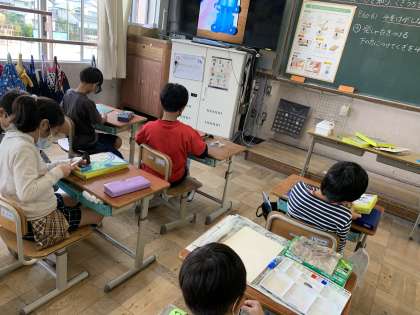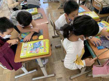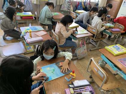前時に,板に絵をかいて色を付けました。