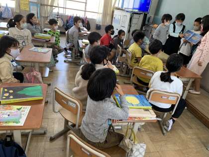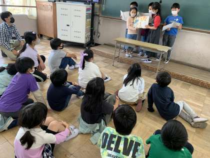 国語の学習で班で意見を出し合って決めた本の読み聞かせをしている様子です。