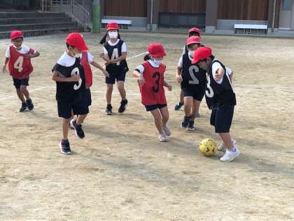 準備や後片付けも上手になってきた2年生。どうすればパスが繋がるか,どうすればシュートが決まるのか,みんなで考えていました。