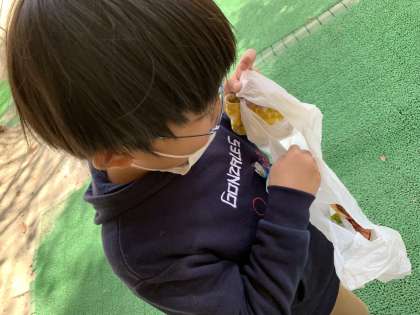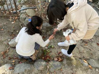 図画工作の授業で,秋の葉を集めています。枯れ葉にも赤や黄色の色がついていてとても鮮やかで美しいです。どんな作品が出来上がるのか楽しいですね。