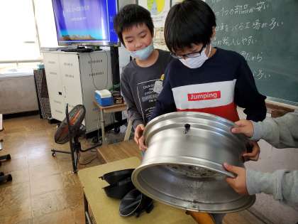 自動車がどうやってできているのかを考えて,単元の学習問題をつくりました。子どもたちは,本物のハンドルやタイヤを実際に触ることができて大喜びでした。