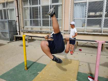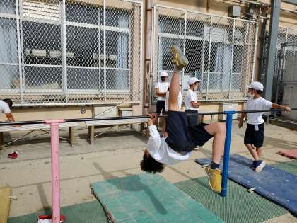体育では鉄棒運動を行っています。「あと少しで逆上がりができそう!」「やった!新しい技を習得したよ!」など,一生懸命に取り組む姿が見られました。