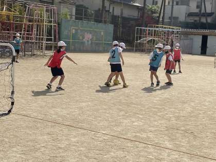 サッカーの学習が始まりました!3年生のときのことを思い出しながら、チームで作戦を立てていきます。準備もとても早くできるようになり、困っている友達がいると、違うチームでも声をかけて一緒に準備する姿がみられました。