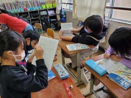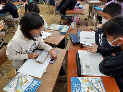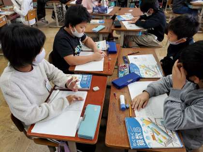「0を入れるかどうか」について話し合った後は,自分で平均の問題を作ってグループで出し合いました。「えぇ〜,難しいな・・」「待って!分かった!!」など,楽しみながらお互いに問題を出し合う姿が見られました。