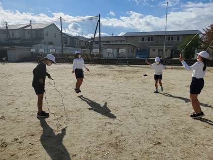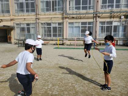 今日の体育では「なわとび」と「ゆっくりかけ足」を行いました。久しぶりのなわとびに「うわっ!こんなに難しかったけ?」「意外と体力奪われる〜!」と,興奮気味の子どもたちでした。