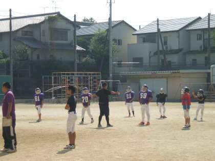 爽やかな秋空のもと,アメリカンフットボールが練習に励んでいます。