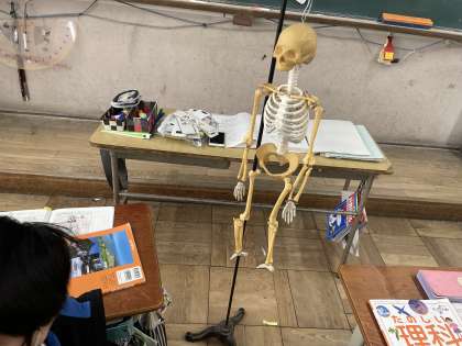 人体模型をつかって、体の骨はどのようになっているのか確かめました!「予想とにていた!」「こんな風になっているなんて知らなかった」など自分の予想と比べてどうだったから話し合っていました!