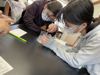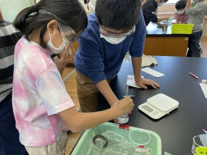 水溶液の量を増やしたり温度をあげたりすることでものの溶け方は変わるのか調べました。なかなか溶けないと必死になっていました。