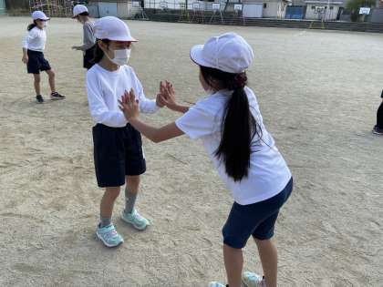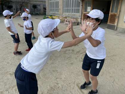 体育の学習では「すもう遊び」をしました。まずは手押しずもうです。押したり、引いたら考えながら、いろいろな友達とすることができました!しゃがんだり,足だけでのすもうも楽しんですることができました。