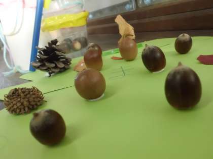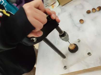 どんぐりに穴をあけて,どんぐりごまを作ったり,