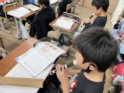 リコーダーで高い「ミ、ファ、ソ」を吹きました!ハミングをしっかりして、きれいな音が出るようにする姿がみられました!歌もパートに分かれて、追いかけあって歌いました。