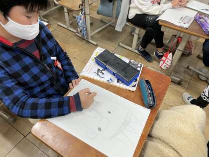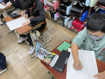 図画工作では、初めて彫刻刀を使って版画を刷ります!今日は下書きをして、どんな絵にするか考えました。テーマは「鬼」です。どのようにほり進めるのかも考えながら、自分なりの鬼を書く姿が見られ、次から彫刻刀を使うのがとても楽しみな様子でした!