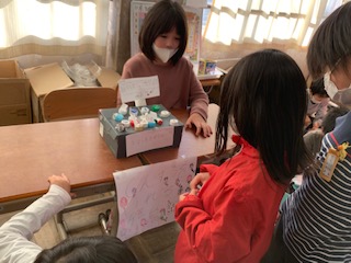 生活科「あそんでためしてくふうして」の学習で作ったおもちゃを,1年生を招待して遊んでもらいました。