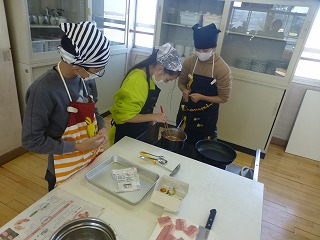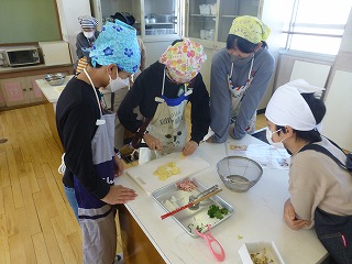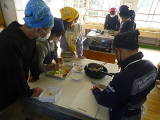 家庭では「まかせてね今日の食事」では,1食分の献立計画を立てる学習をしています。今日は調理実習です。「豆腐と野菜のチャンプルー」「ベーコン巻き」「ベーコンポテト」の中から1種類を選んで調理しました。