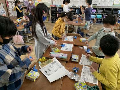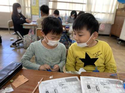 電気の学習で,回路を自分たちで考えながら作っている様子です。
