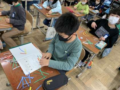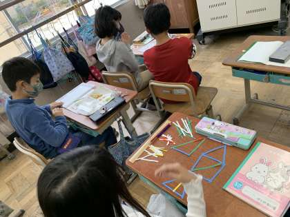 三角形のみで何かを作る難しさを感じながら,大きさを合わせたり回転させたりしながら作っていました。