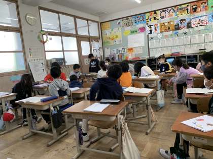 出来上がった物語をみんなの前で発表している様子です。