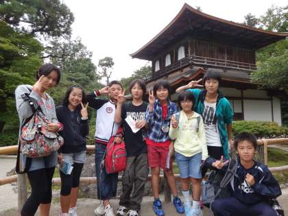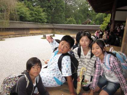 社会科で学習した銀閣や竜安寺の庭園を実際に見ることで歴史にふれることができました。竜安寺の庭園の遠近法や15個の石の配置など,「すごい」「本当や」と感動の声が聞こえてきました。