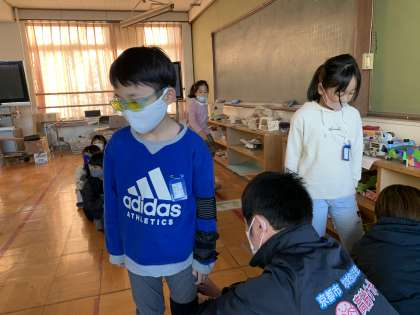 黄色く見える眼鏡をかけて,足や手におもりをつけ,体にリュックをせおって歩きました。「ひじやひざが曲がりにくかったです。」「周りが見えなくてぶつかりそうになった」という声が上がりました。高齢者の体験をして,手助けしたいという思いが強くなったようです。また,高齢者の寸劇を見て,直したらいいところ,自分だったらどうするかというのを一生懸命考えることができていました。生活に生かしていってほしいですね。