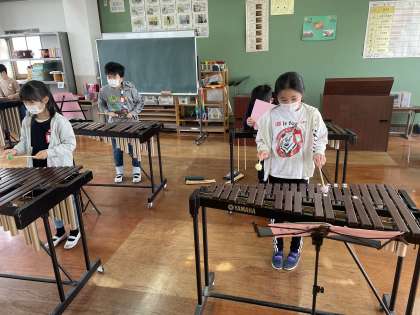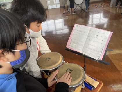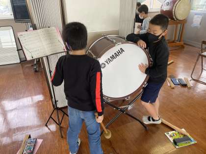 自分が演奏したいパートに分かれて、楽器を演奏しています!はじめは楽譜を読むことに精一杯でしたが、だんだんリズムになれてきました!