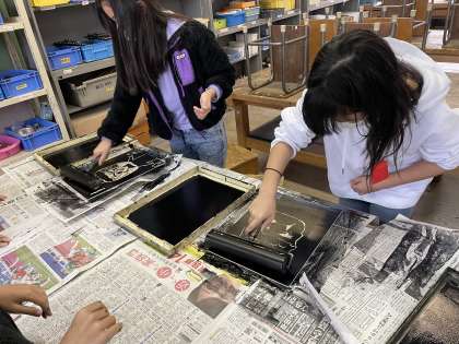 版画を刷りました!たてやよこにローラーを動かし,インクをのばしてつけました。その後バレンを使って,版を刷りました。先に刷った子は後で刷っている友達にアドバイスをしてくれていました!