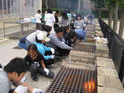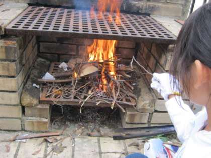 中には,15分で火が起こる班もありましたが,なかなか火が起こらない班もありました。新聞紙を下にセットし,その上に小枝をたくさん積み上げ,火を点け,そーと息を吹きかけました。