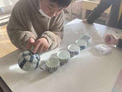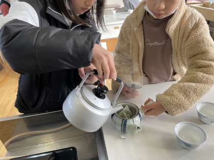 社会科では、「古くから受けつがれてきた産業がさかんな宇治市」の学習がはじまりました!はじめに、宇治茶と宇治茶ではないお茶の飲み比べをしました。急須でお茶を入れ、味の違いを確かめながら飲んでいました!