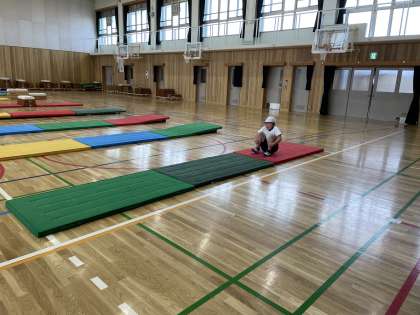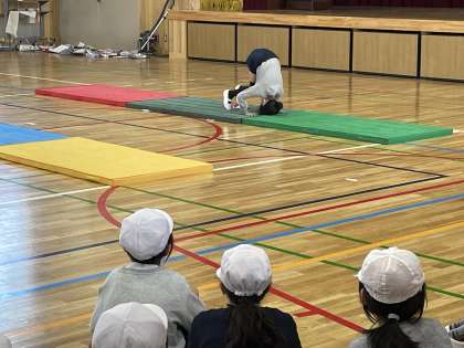 体育の学習の中で「見て見てタイム」があります。この時間では、自分が出来るようになった技や友達のここがすごい!というところを紹介しています。その技を見て,いいところ,自分が技をするときに気をつけたいところを交流しました(^^)