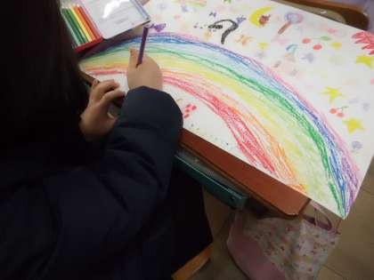 「私は雲の上で,虹の線路の上をイルカと一緒に走っているよ!」