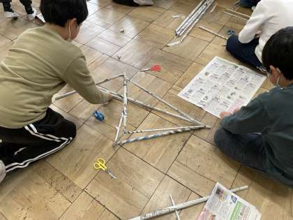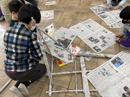 「つなぐんぐん」の学習をしました!新聞を丸めて、どんな風につないでいくか考えました!はじめからテーマを決めてつないだり、つないでいく内に違うものにも見えるといってつなぎ方を変えたり、工夫しながら作っていく姿がみられました!