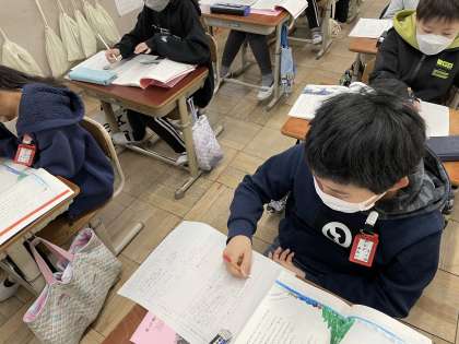 「初雪のふる日」の学習をしています。教科書に書いてある、言葉や表現を見つけ、登場人物の女の子の様子や気持ちを想像しました!