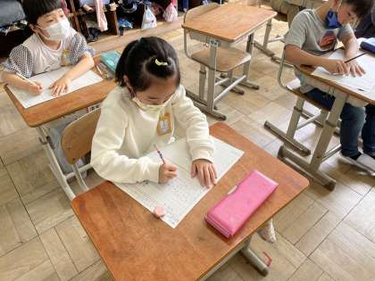 書写の学習がはじまりました!姿勢、えんぴつの持ち方に気をつけて、ていねいに字をかくことができました!また、実際に習字セットをみて、「習字セットを使って字を書くのがたのしみだね!」と話す様子が見られました!