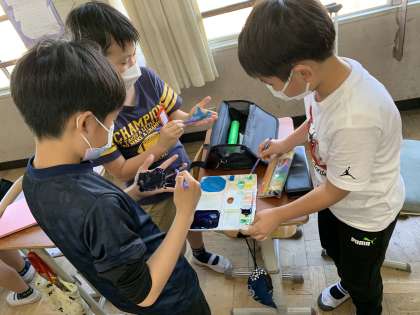 みんなで頑張っていこうという意味と,学年目標である「High Five」にかけて,みんなの手を模造紙にうつしました。みんなで1年間,目標目指して頑張りましょう。