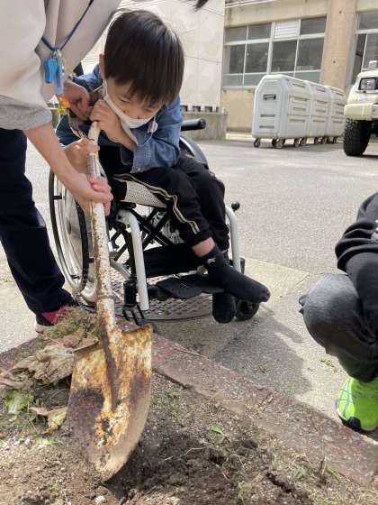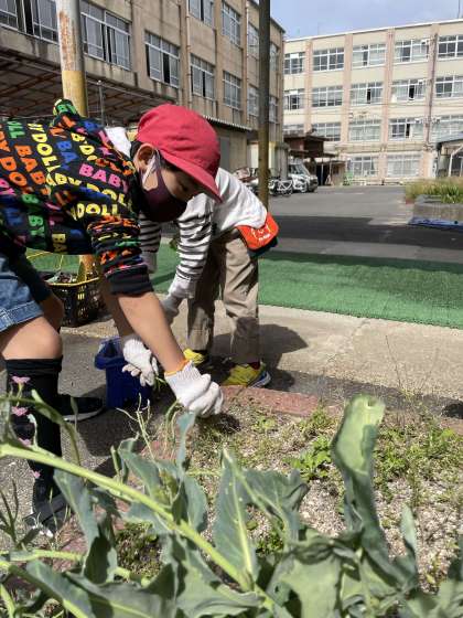 雑草を抜き,スコップを使って,土を柔らかく,ふわふわにしました。テントウムシ,たくさんのアオムシ,ダンゴムシ,名も分からぬいろいろな虫たちなど,たくさんの生き物と出会いました。喜んで手にのせる子,「ワー!」と言って逃げる子,黙々と土を掘り続ける子,こどもたちの様々な表情を見ることができました。