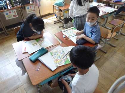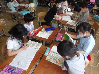 遊園地の絵にいる人のことが分かるように大事なことをメモしました。服の色や模様,身につけているものなどを確認してメモをつくりました。また友達に分かりやすく伝えるために,大きな声ではっきりと詳しく話すことを意識しました。学習の最後にみんなで迷子のお知らせをして,大盛り上がりでした。
