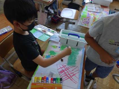毎日の生活で感じるドキドキワクワク。楽しかったことやがんばったことなどをクレパスや絵の具を用いて描いています。絵の具では、「水多く混ぜて色をつくること」「筆をおくようにして塗ること」を意識しながら、作品を仕上げました。完成した作品からは子どもたちの楽しかった思い出が伝わってきます。また作品を見ながら、たくさんの思い出を話していきたいと思います。