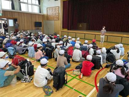雨は降っていなかったのですが、念には念を入れ、体育館にて出発式…。