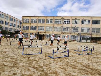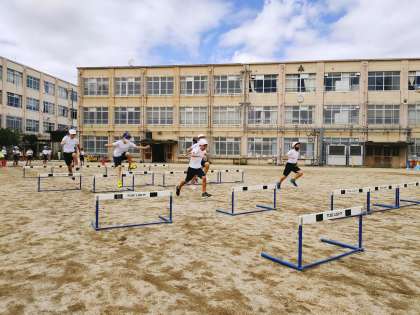 体育科の学習では,小型ハードル走をしています。自分に合ったインターバルを見つけ,リズムよくハードルを越えていきます。
