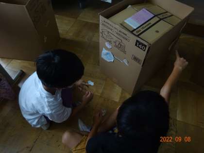 家から集めた材料をつかって、どんなあそびができるか考えていきます。今日は持ってきた材料を「宝箱」に入れました。さあどんな宝箱ができるのでしょうか。楽しみです。