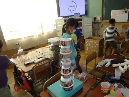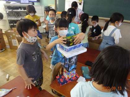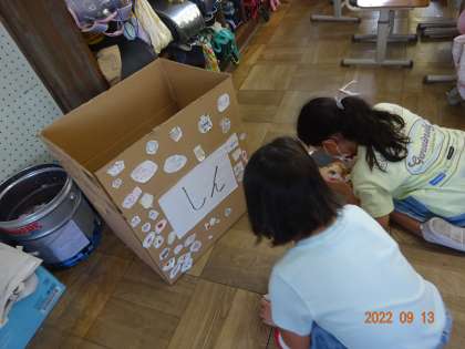 「おもちゃ宝箱」が完成して、今回は家から集めた材料を使っていろいろな遊びをしました。箱をつんだり、ペットボトルをならべたり、キャップを狙ったところに投げたりなどたくさんの遊びを思いついていました。これからはテーマごとに遊びを考えていきます。どんな遊びが生まれるのか。楽しみです!