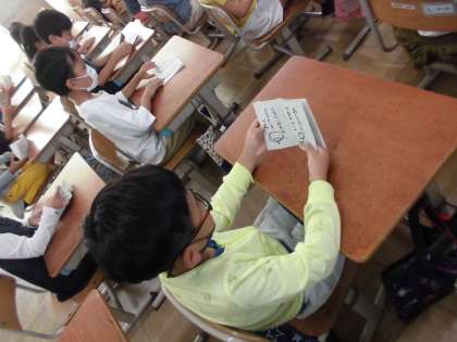 栄養教諭による食の学習では,苦手な食べ物と仲良くなれる方法を学習しました。「まほうのたべかた」の本が配られ,興味しんしん!さっそく給食時間にためしてみました。苦手な食べ物でも楽しい音やおいしい味を見つけて,食べられた人がたくさんいました。