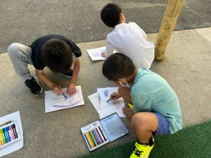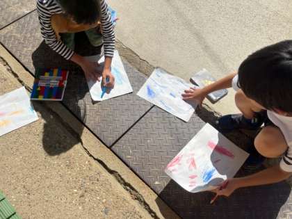 いろいろな「でこぼこ」をさがして,クーピーや色鉛筆でこすりだしました。
