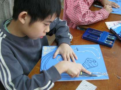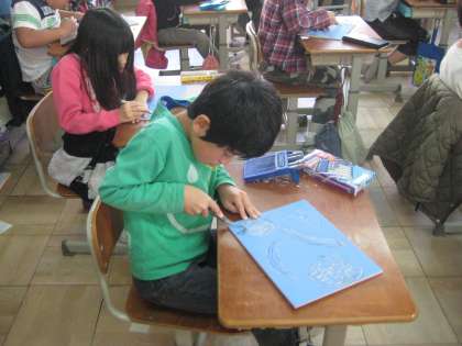 育成学級の4人の3年生も交流学級の友だちと一緒に、初めての彫刻刀にドキドキしながら楽しんで彫り進めています。