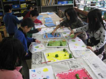 和紙には、野菜の周りに模様がくるように切った野菜のスタンピングをしました。とてもカラフルな和紙が出来上がり、子どもたちも満足そうでした!