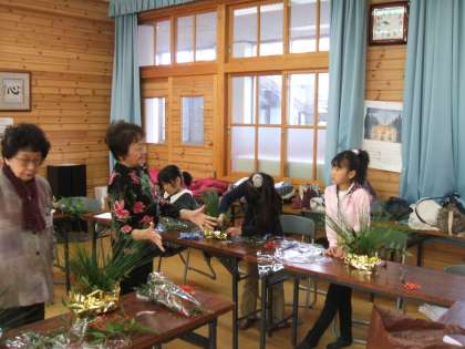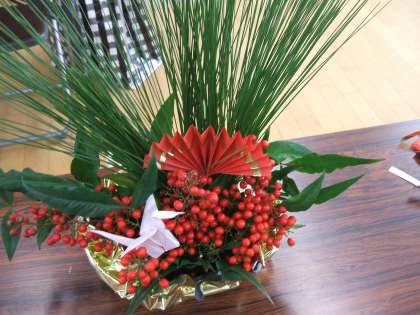 お正月用のお花を生けました。扇と鶴を飾り,一段とお正月らしくなりました。
