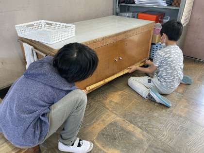 算数科の学習で「身の回りのものの体積と容積」を調べようということで、掃除ロッカーや給食台などの周りの長さを調べました。