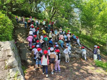 2年生のお兄さん、お姉さんと北堀公園へ遠足に行ってきました。公園まで少し遠かったのですが、頑張って行くことができました。公園に着いてからは、たてわりグループでたくさん遊び、美味しいお弁当を食べました。お弁当などのご準備ありがとうございました!!