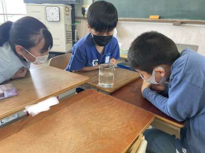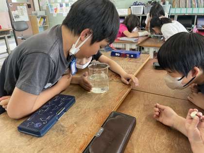 ビーカーに入ったメダカのヒレの形や大きさをしっかりと観察していました。
