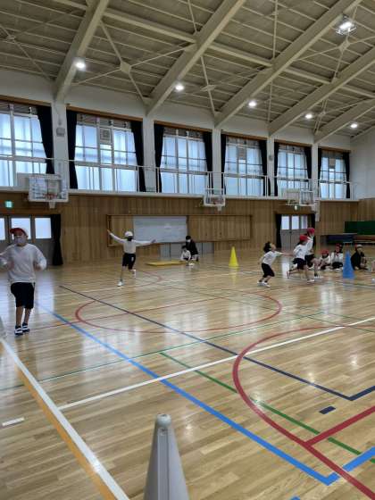 体育館で、走ったりカニオニをしたりして、みんなで楽しく体を動かしました。カニオニをする時は、オニも、逃げるほうも、どちらも必死、真剣です。